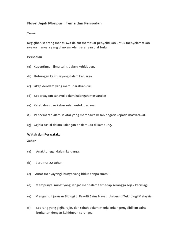 Persoalan latar masyarakat perwatakan nilai dan pengajaran watak utama Novel yang telah saya kaji dalam tingkatan 2 ialah Jejak Monpus karya Zulaiha Paikon. View novel jejak monpus bmpdf from CTU 152 at University Teknology Mara Campus Arau Perlis - Malaysia. Dia bimbang akan keselamatan Zahar apabila penduduk kampung menyalahkan.